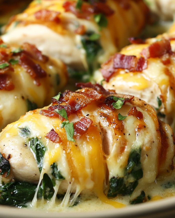 Baked Hasselback Chicken with Cheese, Spinach, and Bacon