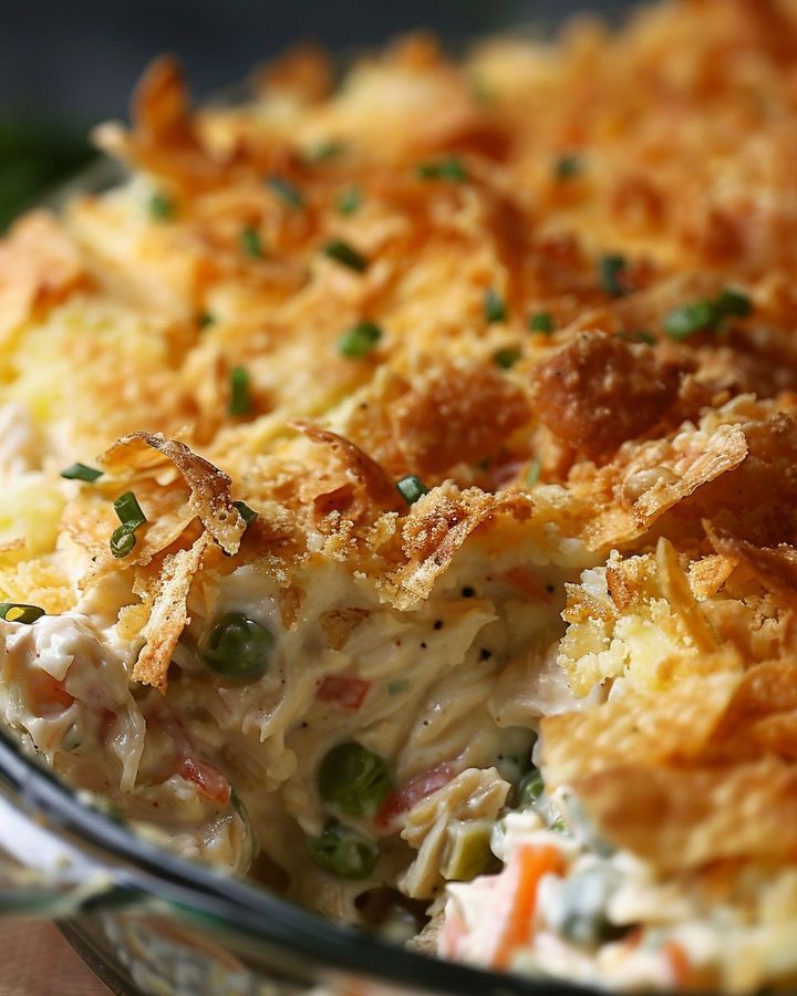 – 1/2 cup of slivered almonds or crushed potato chips (for topping)