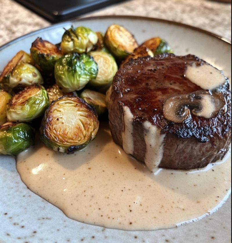 Filet Mignon with Brandy Mushroom Cream Sauce, Parmesan Hasselback Golds & Slightly Burnt Brussels Sprouts 🥩🍄✨