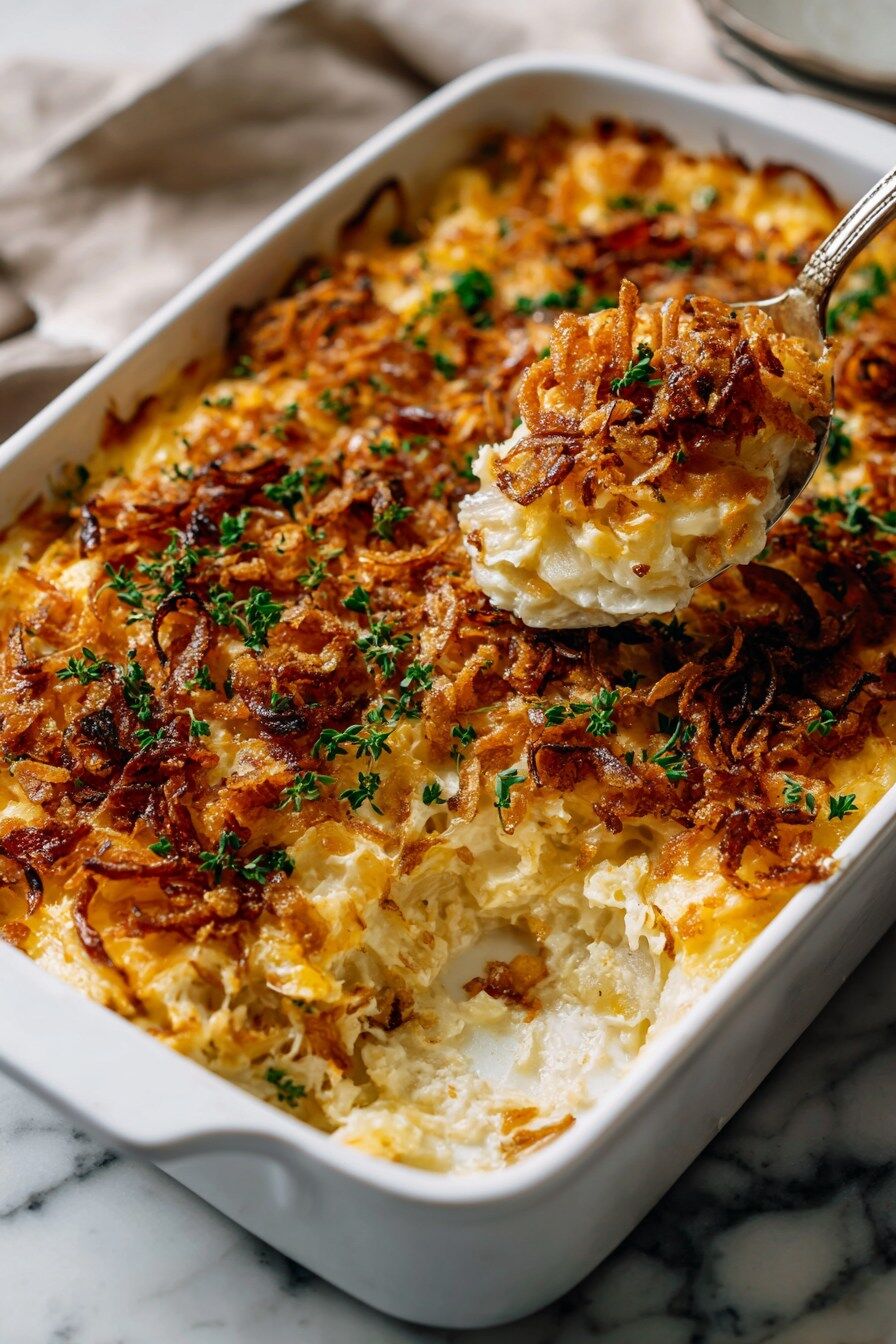 Creamy, cheesy hash browns baked to perfection and crowned with crispy golden onions—comfort food at its finest.