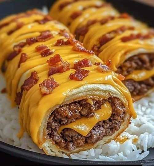 Savor the flavors of a cheeseburger with a twist—ground beef, crispy bacon, melted cheddar, and a hit of garlic butter wrapped in flaky crescent rolls. Perfect for parties, snacks, or a fun dinner! 🎉
