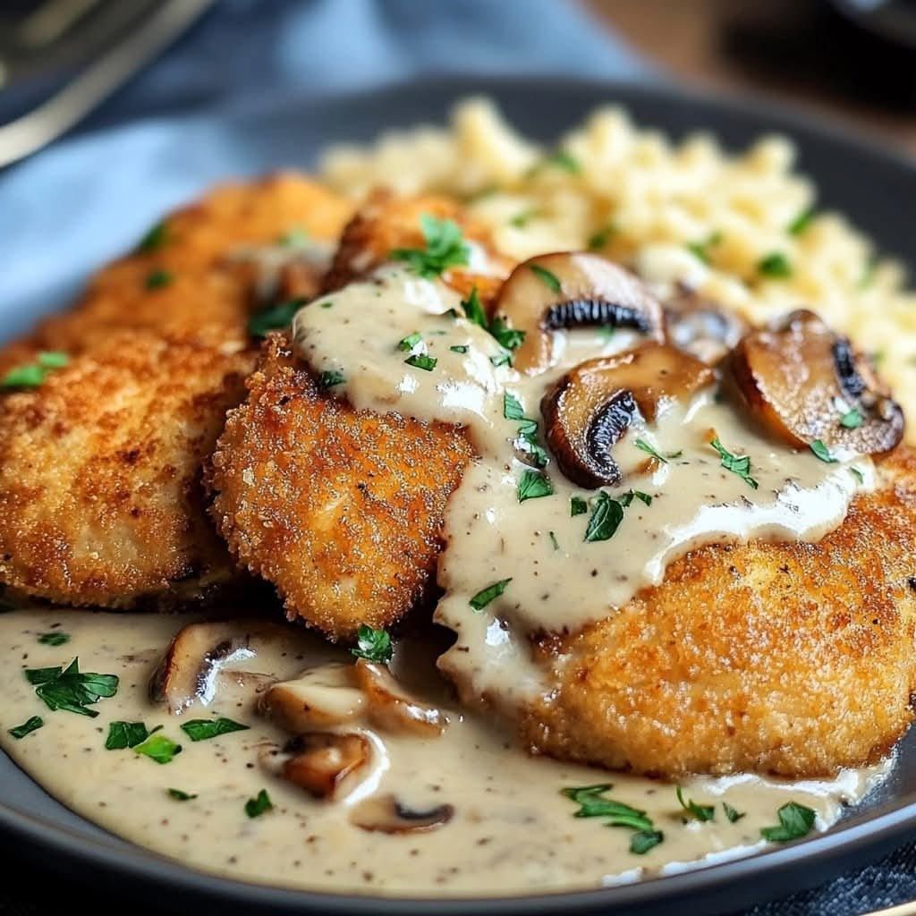 “This Golden Crunch Chicken in Creamy Parmesan Mushroom Sauce is the ultimate comfort dish…”