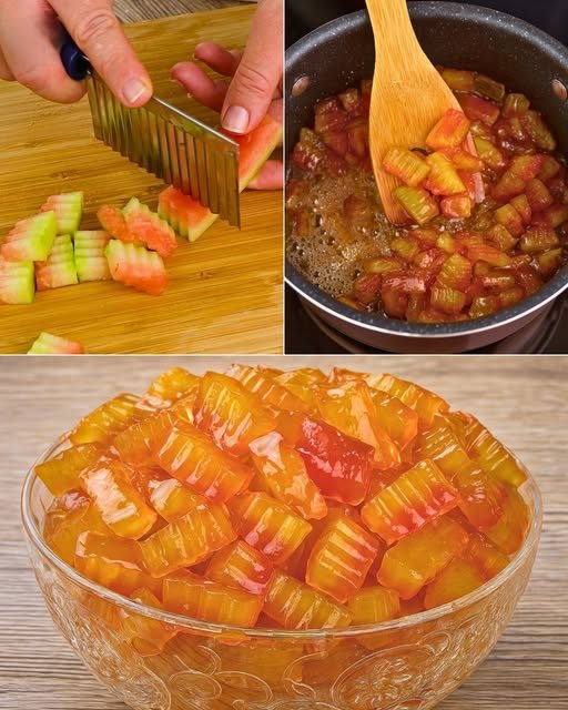 Recycling watermelon rinds into a tasty treat is simpler than you might think. Here’s a method to make caramelized watermelon rinds, turning what would be waste into a sweet snack. Start by cutting the watermelon into pieces, removing the middle flesh, and cutting the rind into manageable chunks. Place these chunks into a pot with 400ml of water and cook covered for 40 minutes, stirring occasionally to ensure even cooking. Once softened, strain the watermelon pieces and set them aside.