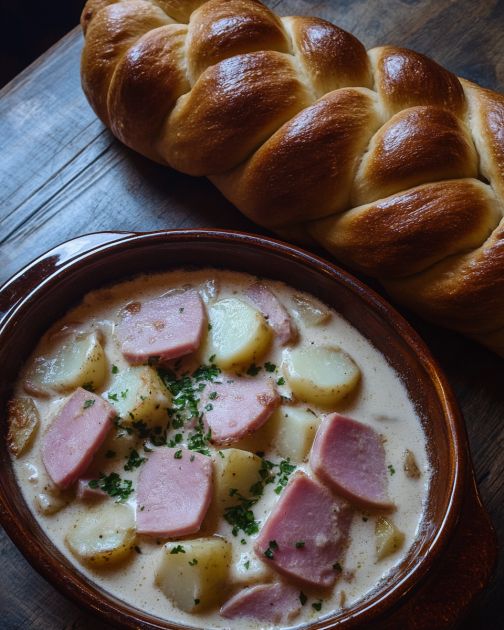 This potato and ham gratin pairs wonderfully with a simple green salad dressed with a light vinaigrette, which helps to cut through the richness of the dish. Additionally, a side of roasted vegetables or steamed green beans can add a nice contrast in both color and texture. For a complete meal, serve it alongside a warm, crusty bread like a golden-brown braided loaf, which is perfect for mopping up the creamy sauce.