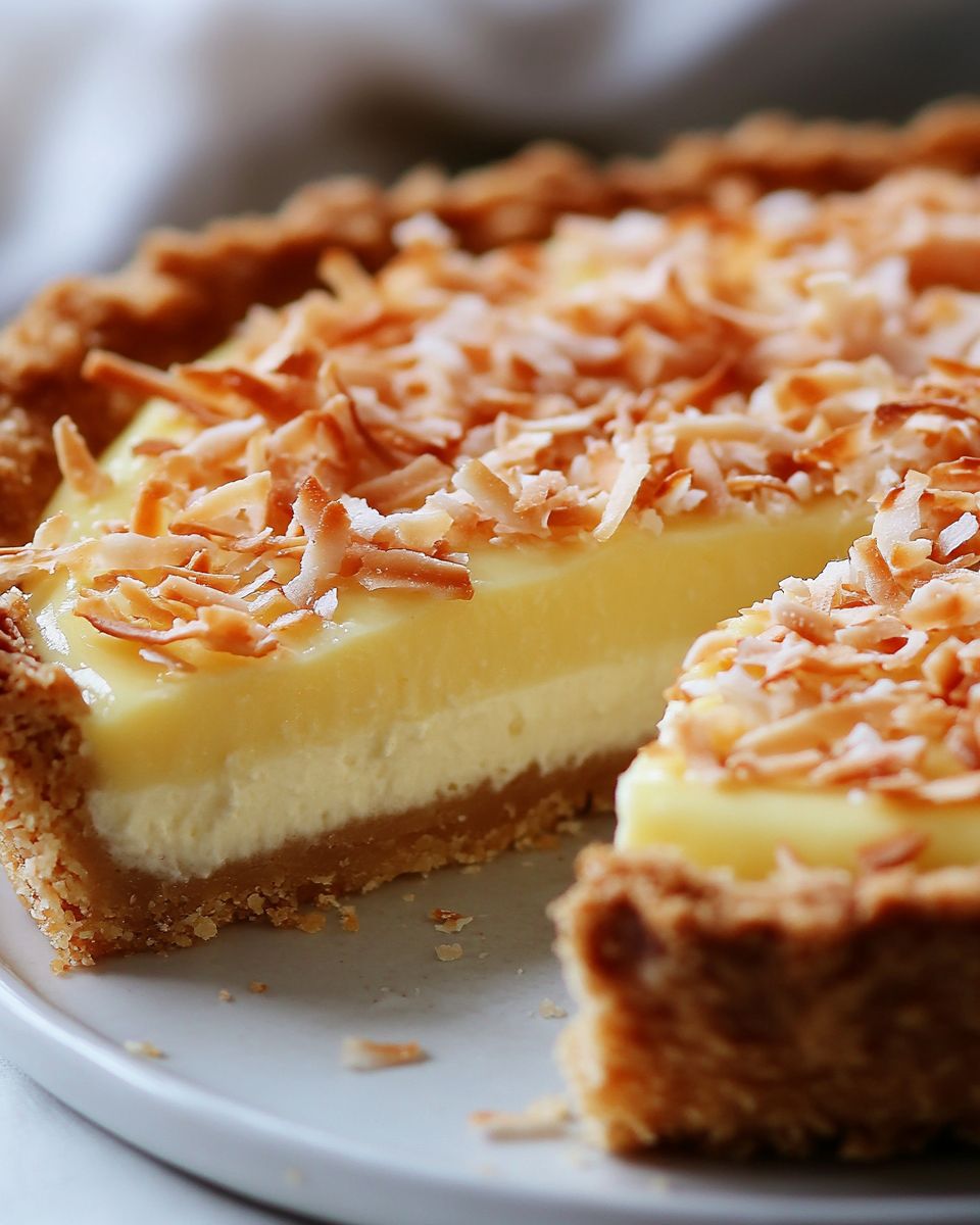 This coconut cream tart pairs beautifully with a dollop of freshly whipped cream or a scoop of vanilla ice cream. For a bit of contrast, you might serve it alongside a tart fruit compote, such as raspberry or passion fruit, which complements the sweetness of the coconut. A hot cup of coffee or a refreshing iced tea can round out the experience, making it a perfect ending to a hearty meal.