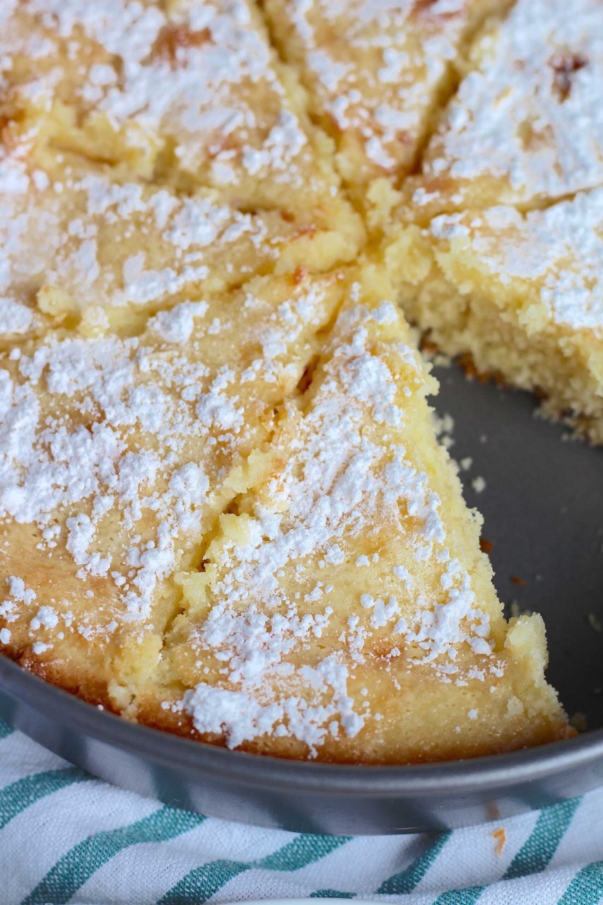 You’ll start out with the cake batter. It’s made from all the usual baking suspects and then the zest of two lemons and the juice of one (no skimping on the lemon flavor here!). Transfer the batter to a cake round or a pie dish, and then set it aside while you mix up the cream layer. You’ll want to mix a softened block of cream cheese until smooth and then mix in some powdered sugar, an egg, and the zest from the second lemon. Pour the cream over the batter and pop it in the oven for about 40 minutes or until the top is turning golden. Allow the cake to fully cool and set before slicing. I know it’s hard, but it’s worth the wait!