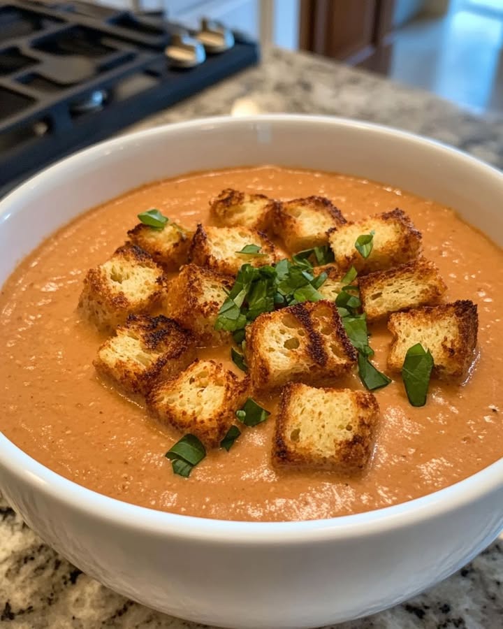 Creamy Tomato Bisque with Grilled Cheese Croutons