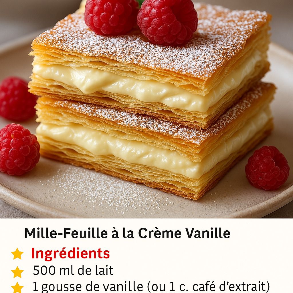 Élégant, feuilleté et fourré d’une crème onctueuse , le Mille-Feuille , aussi appelé Pâtisserie Napoléon , est un classique de la boulangerie française qui ne laisse personne indifférent. Des couches de pâte feuilletée au beurre encadrent une onctueuse crème pâtissière à la vanille , saupoudrée de sucre glace et souvent garnie de fruits rouges frais. Ce n’est pas seulement un dessert, c’est une célébration de la texture et du goût.