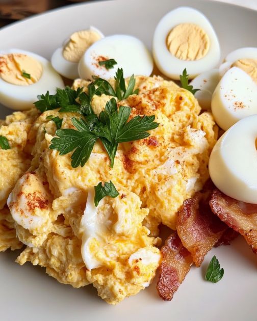 Herb-Seasoned Scrambled Eggs with Crispy Bacon and Hard-Boiled Eggs
