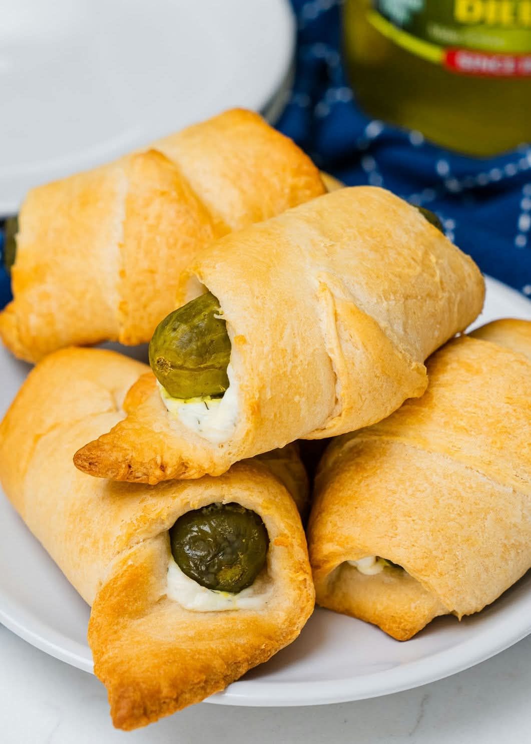 These Baby Dills in a Blanket are a delightful appetizer, offering a savory, tangy, and cheesy twist on the traditional “pigs in a blanket.” Briny baby dill pickles are wrapped in a creamy, spiced cheese mixture and flaky crescent roll dough, then baked until golden and irresistible.