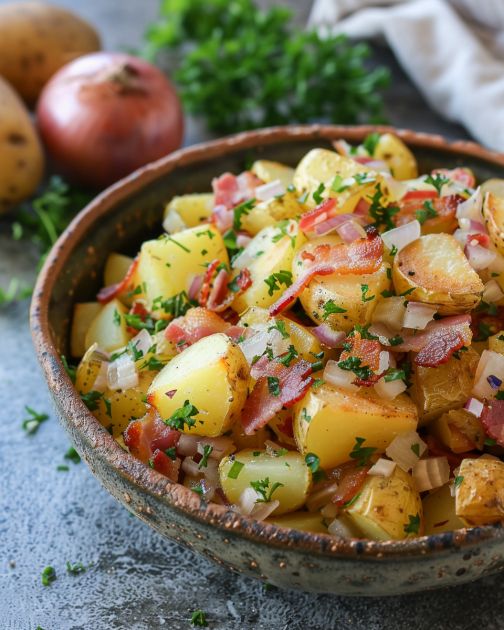 When you think of potato salad, you might picture the creamy, mayo-laden kind we’re all familiar with at family barbecues. But today, we’re taking a little culinary trip to Germany where they do things a bit differently—and deliciously so—with their potato salad. This version is warm, tangy, and can be a refreshing change of pace. What’s lovely about this dish is its heartiness, which comes from the potatoes, balanced by a zesty vinegar dressing and a good punch of flavor from bacon and onions. It’s perfect for those who prefer a non-mayonnaise-based salad, and it’s a real crowd-pleaser at potlucks and picnics, or even as a comforting side on a chilly evening.