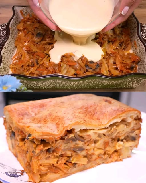 This savory cabbage and mushroom pie is a flavorful, hearty dish packed with sautéed vegetables, herbs, and a tender, moist crust. It’s the perfect blend of creamy, crunchy, and satisfying—ideal for brunch, lunch, or dinner. With an aromatic filling of cabbage, mushrooms, carrots, and onion, wrapped in a yogurt-based batter, it’s a crowd-pleasing comfort food that feels both rustic and elegant. Whether you’re serving it warm straight from the oven or cold the next day, this pie is always a winner.