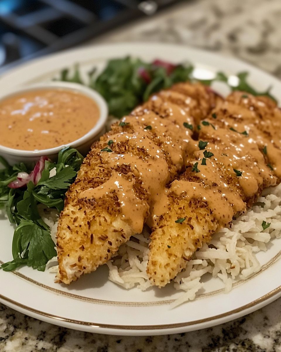 Crispy Coconut Chicken Tenders with Bang Bang Sauce