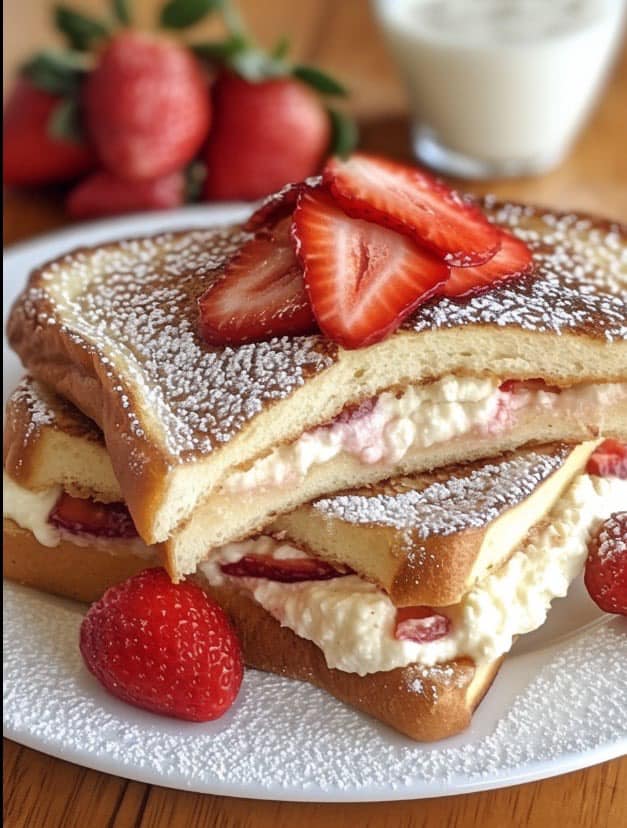 This delicious French toast recipe is perfect for a weekend breakfast or brunch. It’s filled with a creamy strawberry cheesecake mixture and topped with a drizzle of maple syrup, fresh strawberries, and a sprinkle of powdered sugar. Let’s dive in!