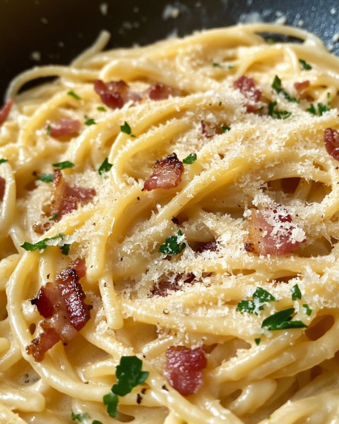 This creamy pasta carbonara pairs wonderfully with a fresh, crisp side salad to balance the richness of the pasta. You could also serve it with some garlic bread for a little extra indulgence. And don’t forget a light, citrusy drink like lemonade or a chilled white wine to refresh your palate between bites!