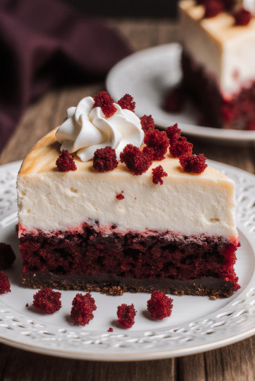 A rich and creamy cheesecake with the classic flavors of red velvet—perfect for any occasion!
