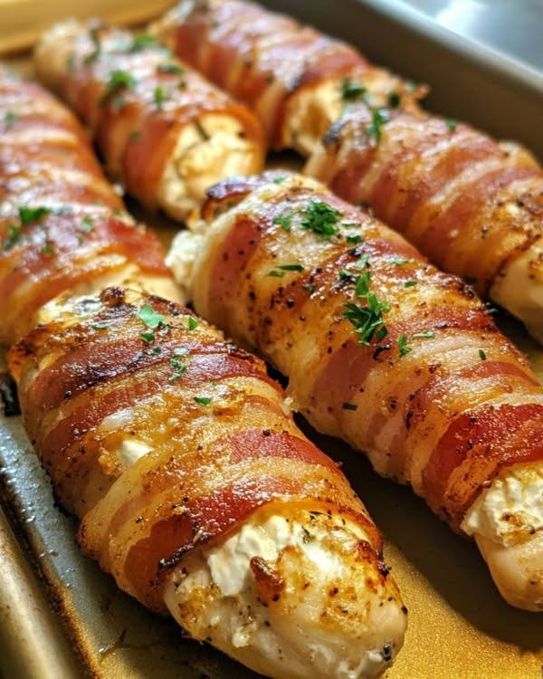 These Bacon-Wrapped Stuffed Chicken Breasts are a flavorful and satisfying dish. Tender chicken breasts are filled with a creamy, cheesy mixture and then wrapped in crispy bacon, creating a delicious and easy-to-make meal.