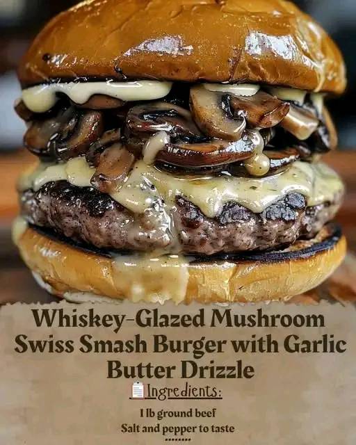 Whiskey-Glazed Mushroom Swiss Smash Burger with Garlic Butter Drizzle