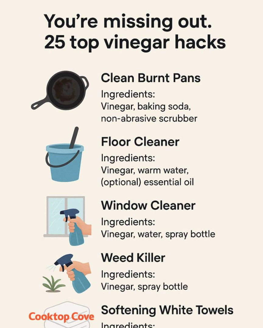 Vinegar is a staple in many households, not just for its culinary uses but also for its versatility as a cleaning agent, deodorizer, and more. This humble liquid, derived from the fermentation of ethanol by acetic acid bacteria, has been used for centuries across various cultures. Whether you’re looking to clean, deodorize, or even improve your personal care routine, vinegar offers a natural and cost-effective solution. Its acidic nature makes it a powerful tool for tackling a wide range of tasks, from cleaning burnt pans to softening laundry. Let’s explore 25 top vinegar hacks that you might be missing out on.